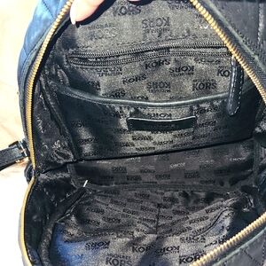 This chic Michael Kors backpack showcases a sophisticated black quilted design, highlighted by striking metallic details. Its compact and modern silhouette makes it an ideal accessory for any stylish ensemble. Slightly used but in great condition. The adjustable straps and sturdy handle ensure both comfort and practicality.