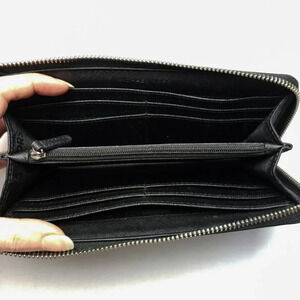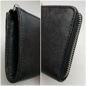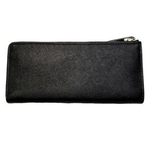 Black coated saffiano leather with crosshatch texture. Zipper closure. Continental with silver hardware.