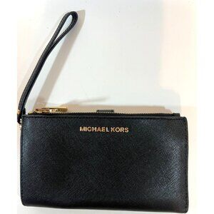 Michael Kors Black Saffiano Leather Wallet Wrist Strap Card Slots 2 zip pockets