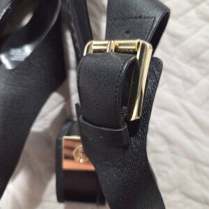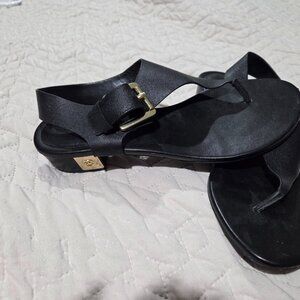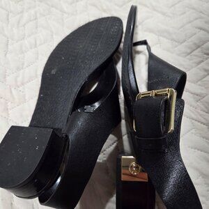 Chic black sandals with a bold gold buckle. Ideal for stylish outings. 1 1/4 heel