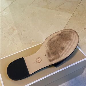 Elegant black sandals with a bold gold chain accent. Perfect for stylish outings.