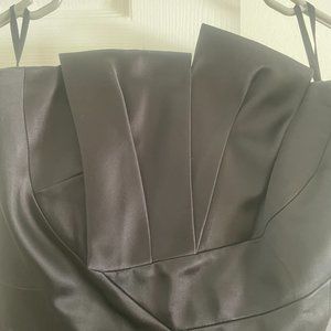 This is a beautiful Michael Kors black satin strapless dress in a size 4 with elaborate front detail and a concealed side zip closure. It is lined and is 60% cotton and 40% acetate. This dress has only been worn twice and is in excellent condition. Measurements are as follows: bust 31", waist 28", hip 36", length 39"