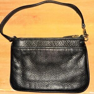 This glamorous Michael Kors clutch features a shimmering sequined exterior in a sleek black color, perfect for special occasions. Its compact design and wristlet strap make it an elegant accessory for evening events.
