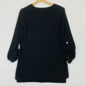 Michael Kors Black Sheer Chiffon Lined Long Sleeve Roll Tab Top. Gold metallic accents. Womens 6.