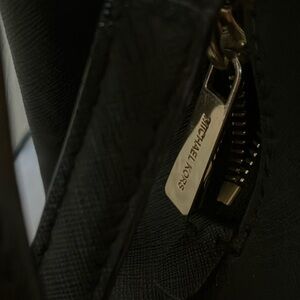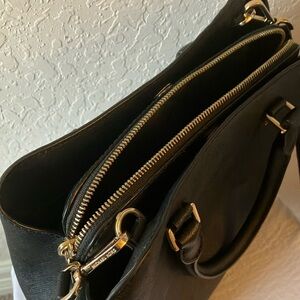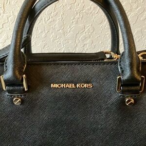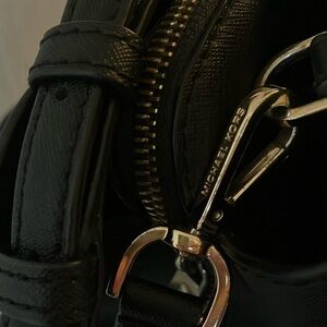 This sophisticated Michael Kors satchel in classic black is crafted from a textured material. It features gold-toned hardware and a convenient top zipper. The medium size and sturdy top handles make it an ideal choice for daily use.