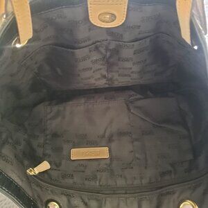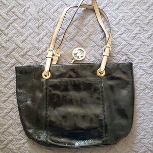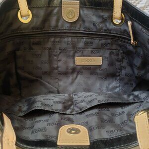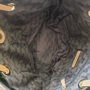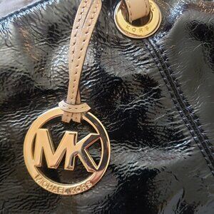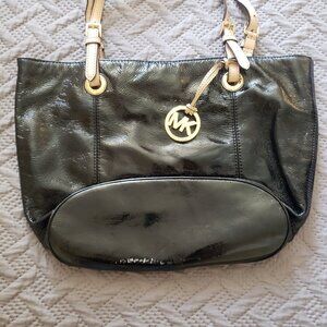 Michael Kors Black Shiny Leather Purse with Tan Strap and Gold Hardware.