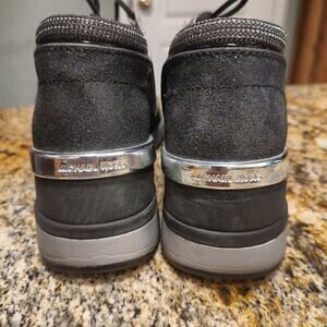 Condition: Gently used with minimal signs of wear. The shoes are in excellent condition with no major flaws. Features: Stylish black and silver design with a combination of leather and textile upper. The shoes feature a rubber outsole for durability and comfort. Measurements: Size 6M (36M). Please refer to the size chart for accurate fitting. Visible Text: The shoes are marked with 'MICHAEL KORS' on the back heel and have a model number 'HJ18A' printed inside. Made in Vietnam.