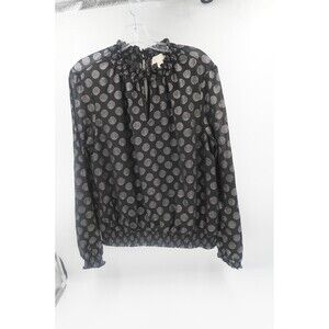 Pre-owned Michael Kors Black & Silver Polka Dot Blouse Smocked Ruffle Mock Neck Size XL. This stylish blouse from Michael Kors features a striking design with silver or metallic polka dots on a black background. The top has a sophisticated smocked ruffle mock neck and a keyhole cutout at the front. The long sleeves and the hem are also smocked or ruched, creating a flattering and comfortable fit. This piece is a versatile option for both professional wear and a chic evening look.