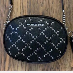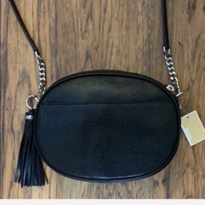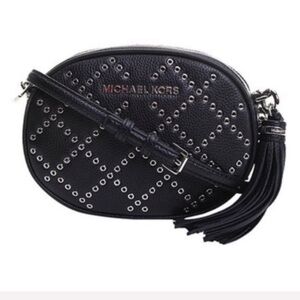Black Studded Ginny Leather Crossbody Bag crafted from durable and supple leather. Silver accents. Pocket on back with magnetic snap. Three card slots inside. Decorative tassel. Lined.