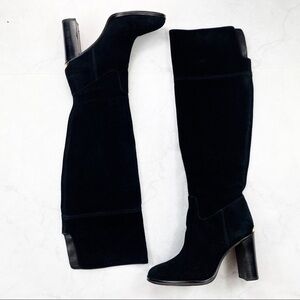 A bold stacked heel accented with goldtone hardware elevates an effortlessly sophisticated over-the-knee boot cast in smooth suede.