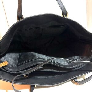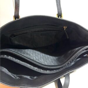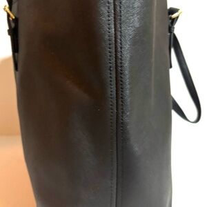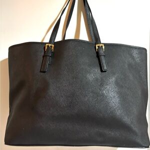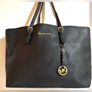Chic black tote by Michael Kors. Features luxurious gold accents. Spacious and stylish for everyday use.3 compartment 6 pockets at interior wall 1 zip closure fabric lining Logo & hangtag at front at front gold tone hardware exterior have minor marks stains hight 11” wide 19” depth 5.5” strap drop 9”