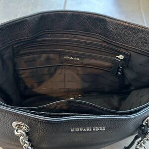Chic large black tote by Michael Kors. Features silver chain handles and a lock charm. Perfect for everyday elegance. Normal wear in great condition.