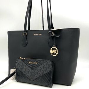 This large tote-style handbag features a sleek black textured leather exterior and a stylish rectangular shape with a slightly trapezoid silhouette. It is equipped with two thin black shoulder straps and adorned with gold-toned hardware, including a circular charm that showcases the Michael Kors brand.
