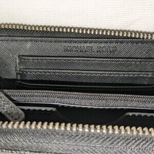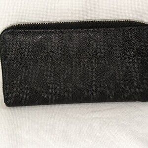 This Michael Kors black signature MK wallet has three spaces for your cards, one zip coin pocket and three other cash pockets. The wallet features the Michael Kors badge on the front and name on the zipper pull. This wallet is in good condition with no stains or tares and only shows some wear on the zipper pull and rivets attaching the badge as seen in photos. The wallet measures 3 1/2" x 6 1/2".