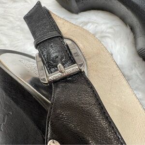 These Michael Kors charm sling shoes feature a sleek black design with a sophisticated logo detail on the toe. Crafted from smooth leather, they offer an adjustable buckle strap for a perfect fit and a comfortable heel for all-day wear.