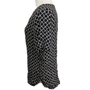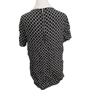Chic and modern Michael Michael Kors women's top in size Small. This lightweight, short sleeve blouse features a bold black and white interlocking circle pattern throughout and a stylish exposed back zipper with logo pull. Crafted from 100% viscose for a soft and breathable feel. Rounded hemline and flattering silhouette make it perfect for both casual and business casual settings.