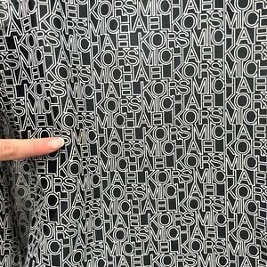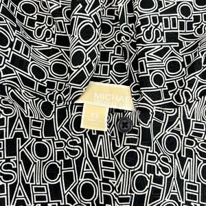 Chic long-sleeve blouse featuring a tie-neck collar that can be styled in a bow or knot. Repeating white “Michael Kors” lettering on a black background for a signature look. Straight cut with button cuffs and center front closure. Lightweight viscose blend feel.