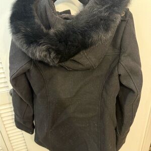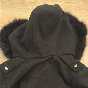 Beautiful black wool coat with real fox fur hood, gold zipper & details. Excellent condition