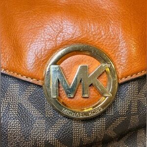 Chic Michael Kors satchel with black and brown tones. Features signature MK logo. Perfect for stylish outings.