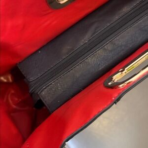 Chic shoulder bag with a black and cream color scheme. Features a metallic logo accent.