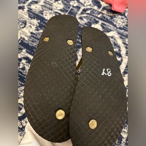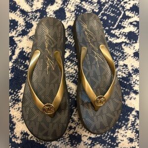 Michael Kors flip flops. Features a black signature base with gold straps. Great condition.