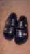 Stylish black sandals with gold MK logo. Croc-embossed design. Comfortable and chic.
