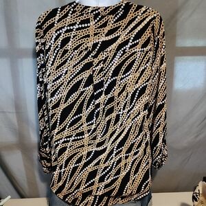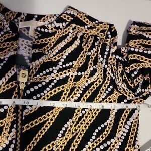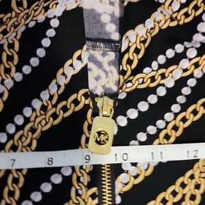 This Michael Kors blouse features a striking black and gold design with a relaxed fit. The 3/4 sleeves and zippered polo collar add a touch of modern elegance, making it a versatile choice for various occasions. Crafted from soft, stretchy fabric, it ensures comfort and style.