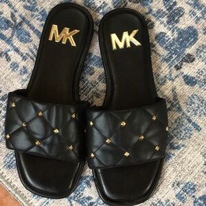 Stylish Michael Kors slide sandals in black with gold accents. Soft super comfortable and excellent condition.
