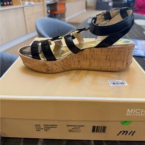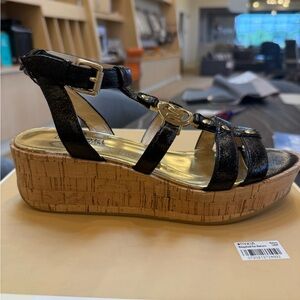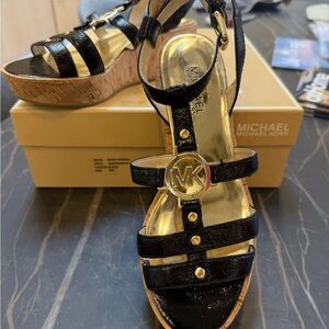 Michael Kors Black and Gold Wedge Sandals with Gladiator Design