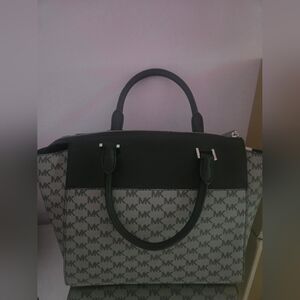 Elegant Michael Kors satchel with signature MK pattern. Features black leather accents and silver hardware. Ideal for everyday use. missing crossbody strap but one can be attached
