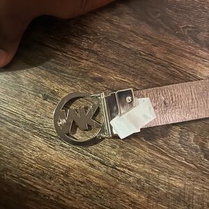 Chic metallic belt with iconic MK buckle. Perfect for any outfit.