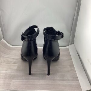 These elegant heels from Michael Kors showcase a sleek black and silver design with a glossy finish. The tall, slim heel and slightly rounded toe create a sophisticated silhouette, perfect for elevating any outfit.