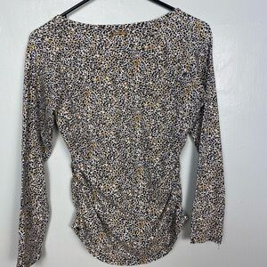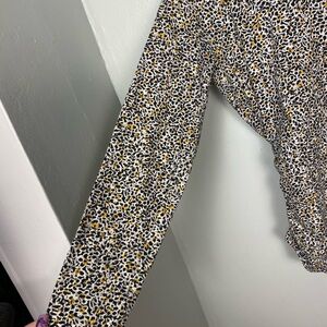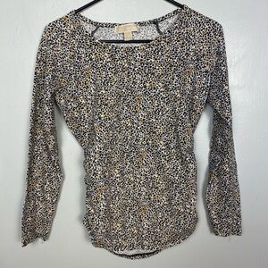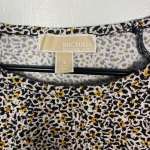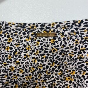 This elegant Michael Kors blouse features a fitted silhouette with a classic black and white color scheme. The blouse is designed with a rounded neckline and long sleeves, offering a sophisticated and timeless look. Its lightweight fabric and intricate floral pattern add a touch of vintage charm to any outfit.