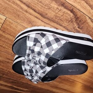 Stylish Michael Kors sandals with a black and white gingham pattern. Comfortable and fashionable for any casual occasion. Fabulous and unique!!! Great shape!