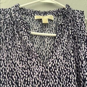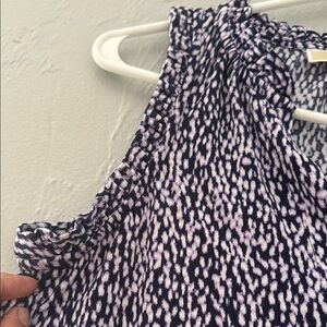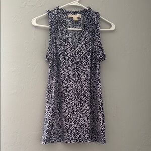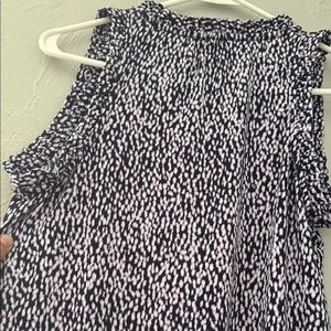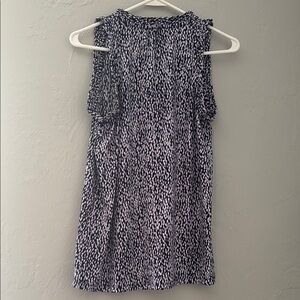 Stylish sleeveless blouse. Features a black and white pattern. V-neck design. Perfect for casual or formal wear.