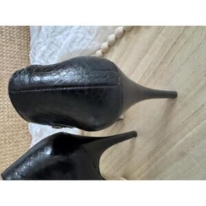 Sleek stiletto heels with pointed toe, platform base, gold zipper hardware, and faux snakeskin texture at the back. The perfect Y2K revival shoe - edgy, chic, and ideal for night out or layered fall looks. Pre-loved in good condition.