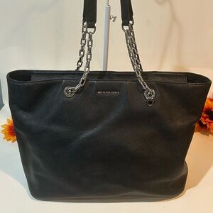 Authentic Michael Kors Black pebble Leather zipper Tote with Chain link Straps