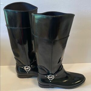 Step out in style with these Michael Kors black heeled rain boots, featuring a sleek design and a decorative strap around the ankle. The knee-high shaft and elegant heel add a touch of sophistication, making them perfect for both fashion-forward outings and formal occasions. Preowned excellent condition, so beautiful! Rubber upper and sole