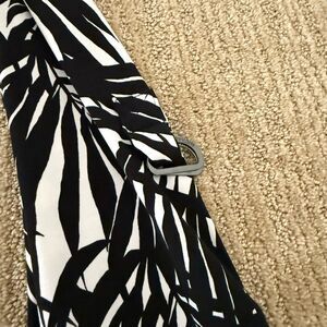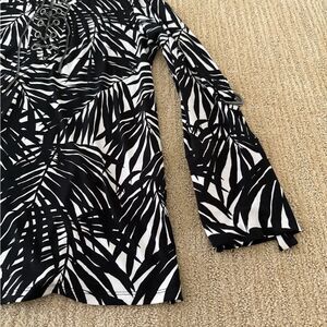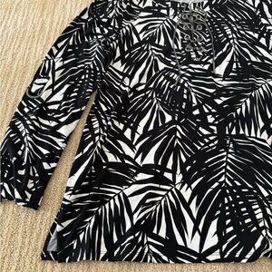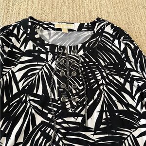 This striking Michael Kors blouse features a bold black and white tropical leaf pattern, offering a dramatic and eye-catching design. The soft, stretchy fabric ensures comfort and ease of wear.