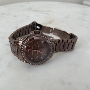 Espresso ion-plated stainless steel case and bracelet. Fixed espresso ion-plated bezel set with crystals. Brown dial with luminous hands and alternating Arabic numeral and index hour markers. Minute markers around the outer rim.