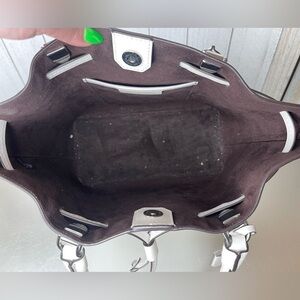 The exterior is made of leather and has a solid finish, while the interior is lined with brown fabric. The bag has white handles made of leather and silver hardware.