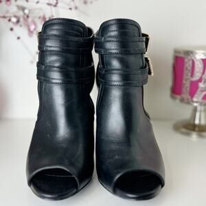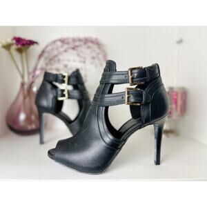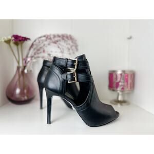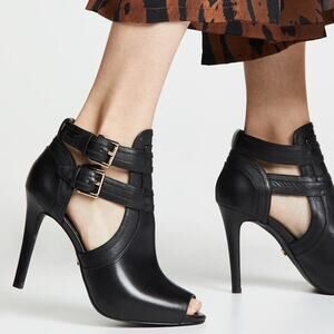 Michael Kors Blaze Leather Stiletto Heel Open Toe Booties Black Size 9 M NWB. Add a sophisticated bohemian accent to skirts and jeans in the buckled straps and cutout design of these Blaze booties from MICHAEL Michael Kors. Round peep toe. Ankle strap. Stiletto & platform heel.