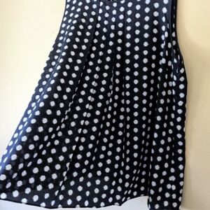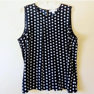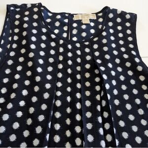 Michael Michael Kors, essential, polished, feminine, versatile, career, office wear, casual or dressy, nautical, coastal chic, flowy, light weight, navy blue background with white imperfect polk-a-dots, sleeveless, pleated on front, blouse, shell tank, camisole, cami, tank top, 1 button closure on back, brand plate at lower left side.
