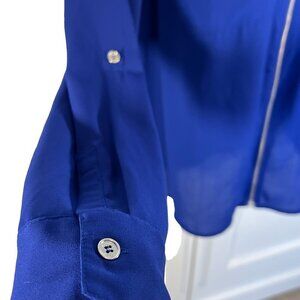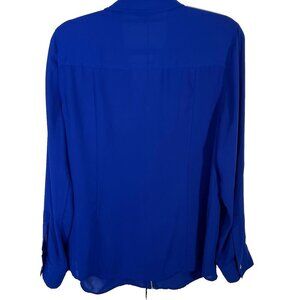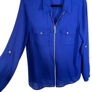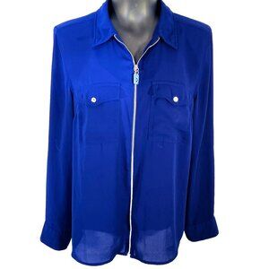 Michael Kors - Blouse Women's 12 Royal Blue Silver Zip Up Long Roll Tab Sleeve