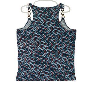 This sleeveless tank top by Michael Kors is an elegant addition to any wardrobe. Featuring a vibrant patterned design, highlighted by tortoise-style ring accents on the straps, it combines style with functionality. Its lightweight fabric ensures comfort and breathability, making it ideal for a variety of occasions during warmer days.