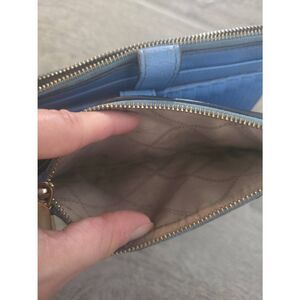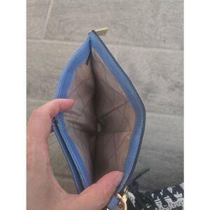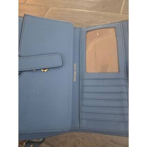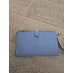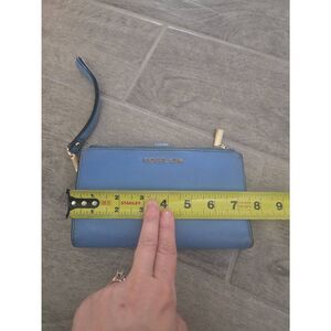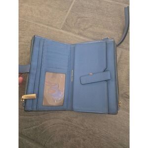 Michael Kors Adele Leather Smartphone Wallet. Approximate measurements in photos. This has been loved, and does show wear, but still completely functional. Wear is visible more up close. Please carefully review the photos*** all zippers work. For a wallet/wristlet, this has tons of space. Blue.