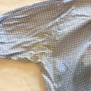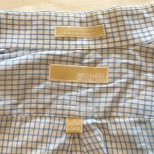 Michael Kors Button-Down Shirt. Light Blue Checkers. Size 16.5 34/35. Slight discoloration in armpit but otherwise in great condition.