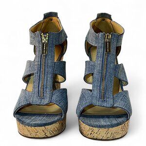 Michael Kors Blue Cork Wedge Sandal Platform Zip Back Washed Denim Size 9.5M
