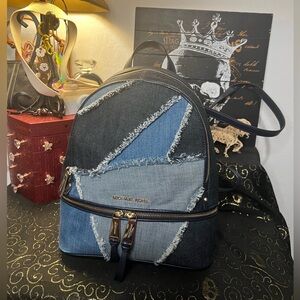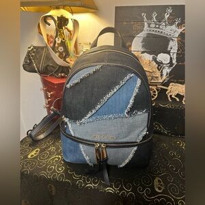 Chic backpack with denim patchwork and leather design. Features blue tones. Perfect for casual outings.