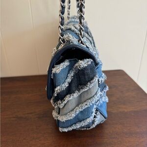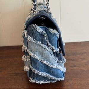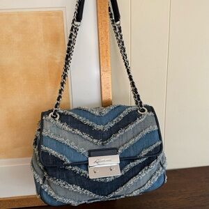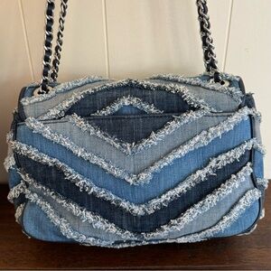 Stylish denim shoulder bag. Chevron pattern with frayed edges. Silver-tone hardware. Perfect for casual outings.